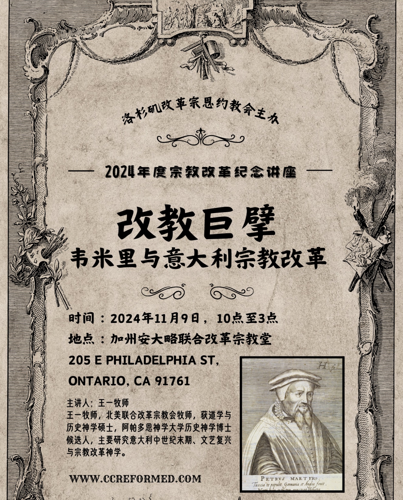 11 月 9, 2024 2024年宗教改革纪念讲座|韦米里与意大利宗教改革|02第二讲 凤凰腾飞在欧洲|王一牧师 Speaker: 王一牧师 Service Type: 恩约讲座 « 2024年宗教改革纪念讲座|韦米里与意大利宗教改革|01第一讲 佛罗伦萨的凤凰|王一牧师 创世记|60 信心的石柱(创世记35)|王一牧师 »